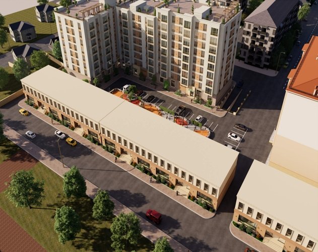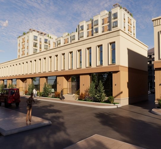 На первых этажах расположена коммерческая инфраструктура для жильцов и гостей комплекса